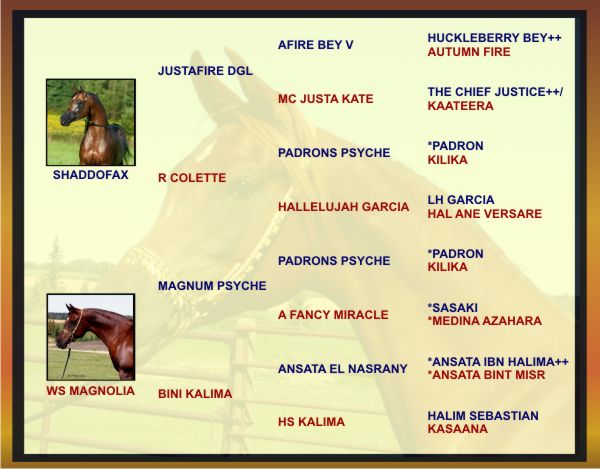 Dam: WS Magnolia Maggie as she is lovingly known to her owners has an impressive pedigree of her own sired by the incomparable Magnum Psyche a world renowned stallion for his numbers of show wins and winning offspring and out of Bini Kalima an Aristocrat mare and Egyptian Event Reserve Champion. |